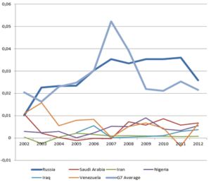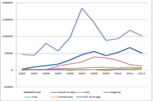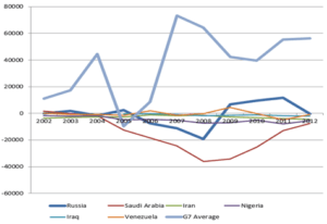 2B: Net Outward FDI: Russia vs. Saudi Arabia, Iran, Iraq, Nigeria, Venezuela + G7 Average (2002-2012) [USD at current prices and current exchange rates, millions]