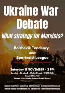 Ukraine War DebateWhat strategy for Marxists? Bolshevik Tendency and Spartacist League2pm, Saturday 11 NovemberRoom MAL 421 Birkbeck Malet Street London WC1E 7HXAll welcome
